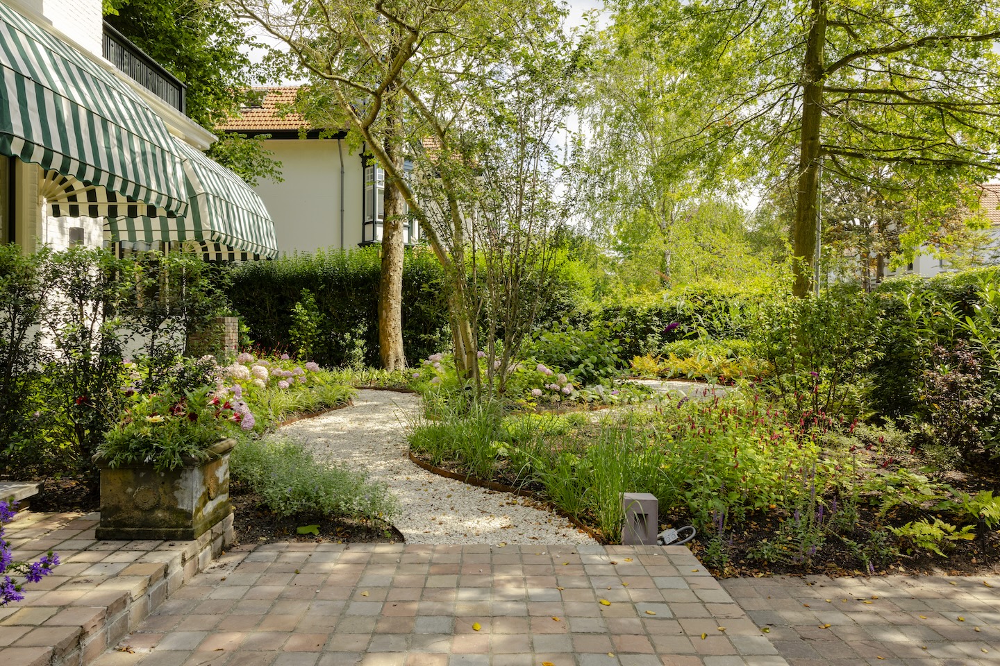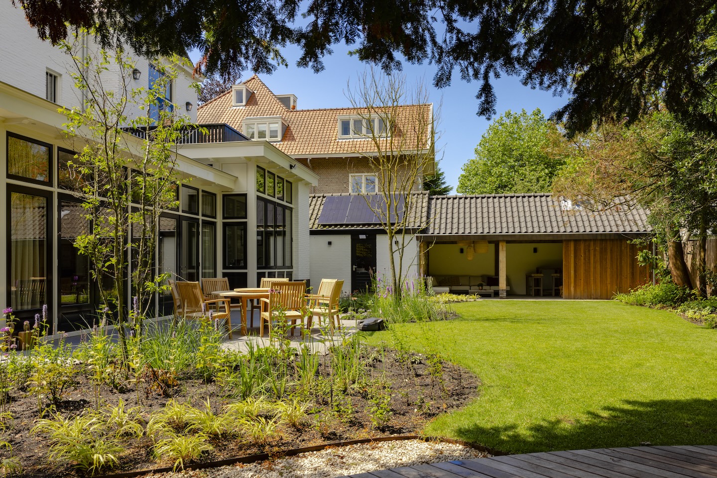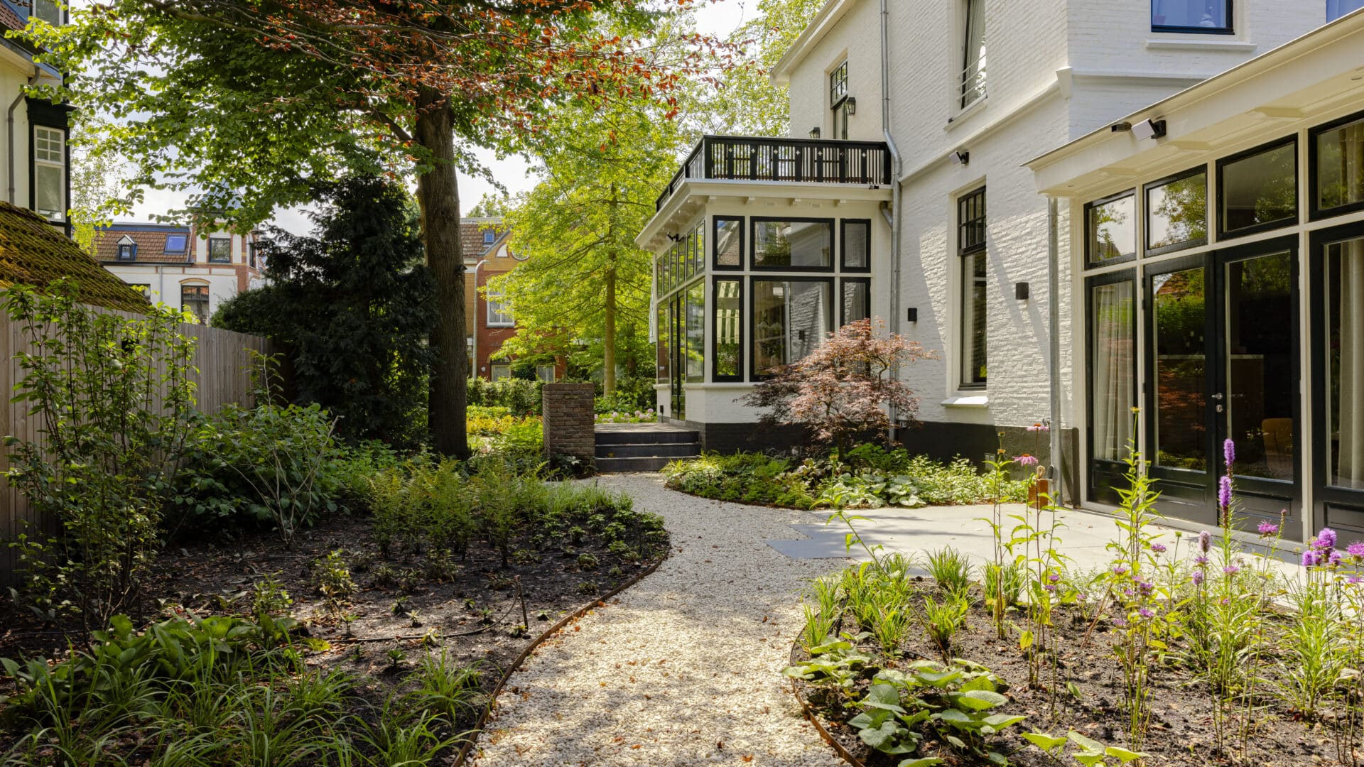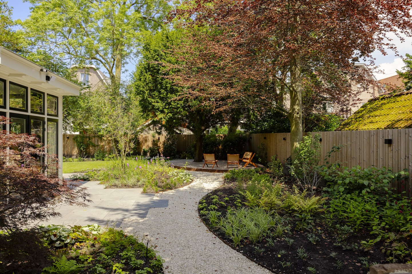 De voortuin is een parkachtige ruimte gebleven, waar bestaande bomen zijn behouden en omrand door weelderige borders. Hier zijn zorgvuldig geselecteerde planten en bloemen toegevoegd, waardoor kleurrijke accenten ontstaan die het hele jaar door een levendige uitstraling hebben. Een terras met keramische tegels in lichte grijstinten biedt een fijne plek om te ontspannen, en is afgesloten door organische borders die het zicht op het gazon verzachten.