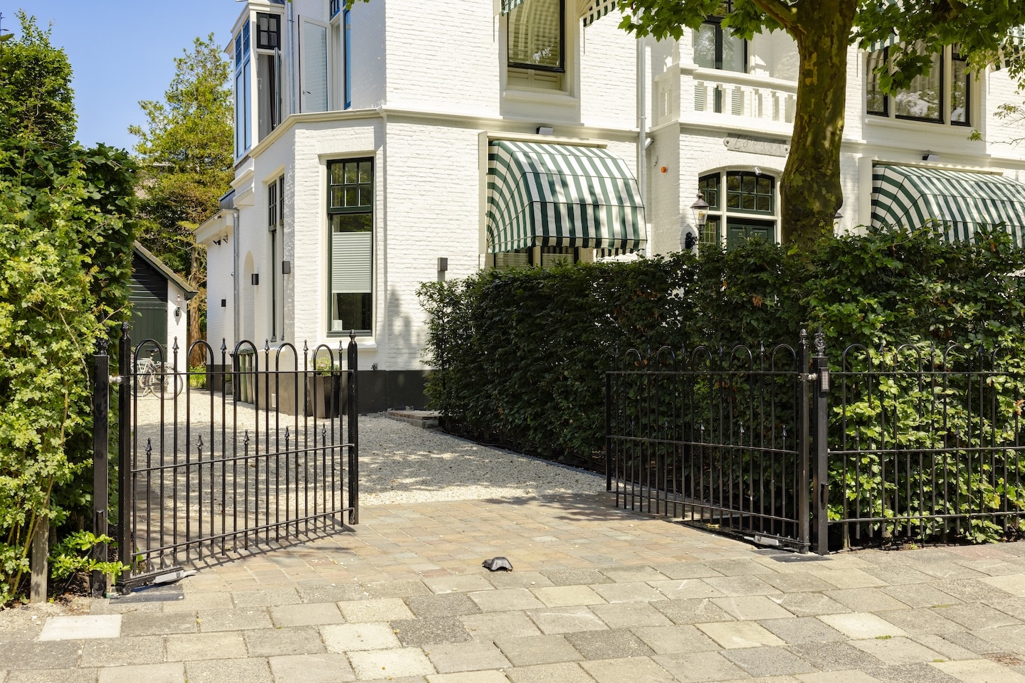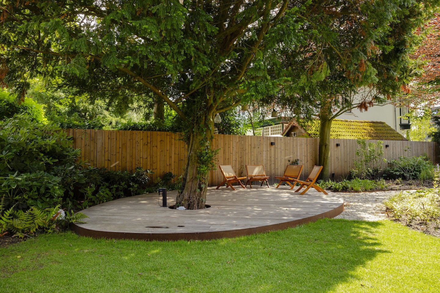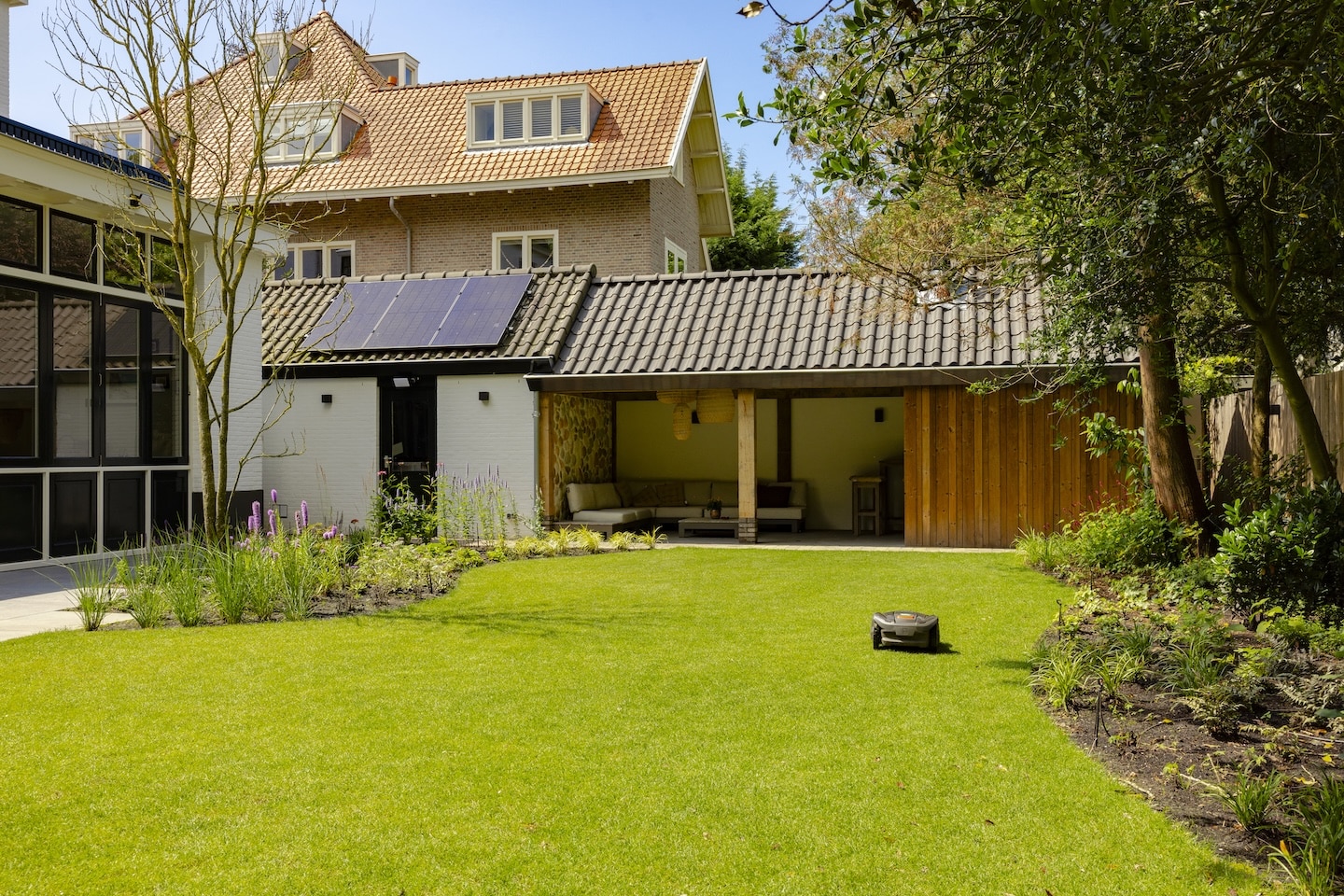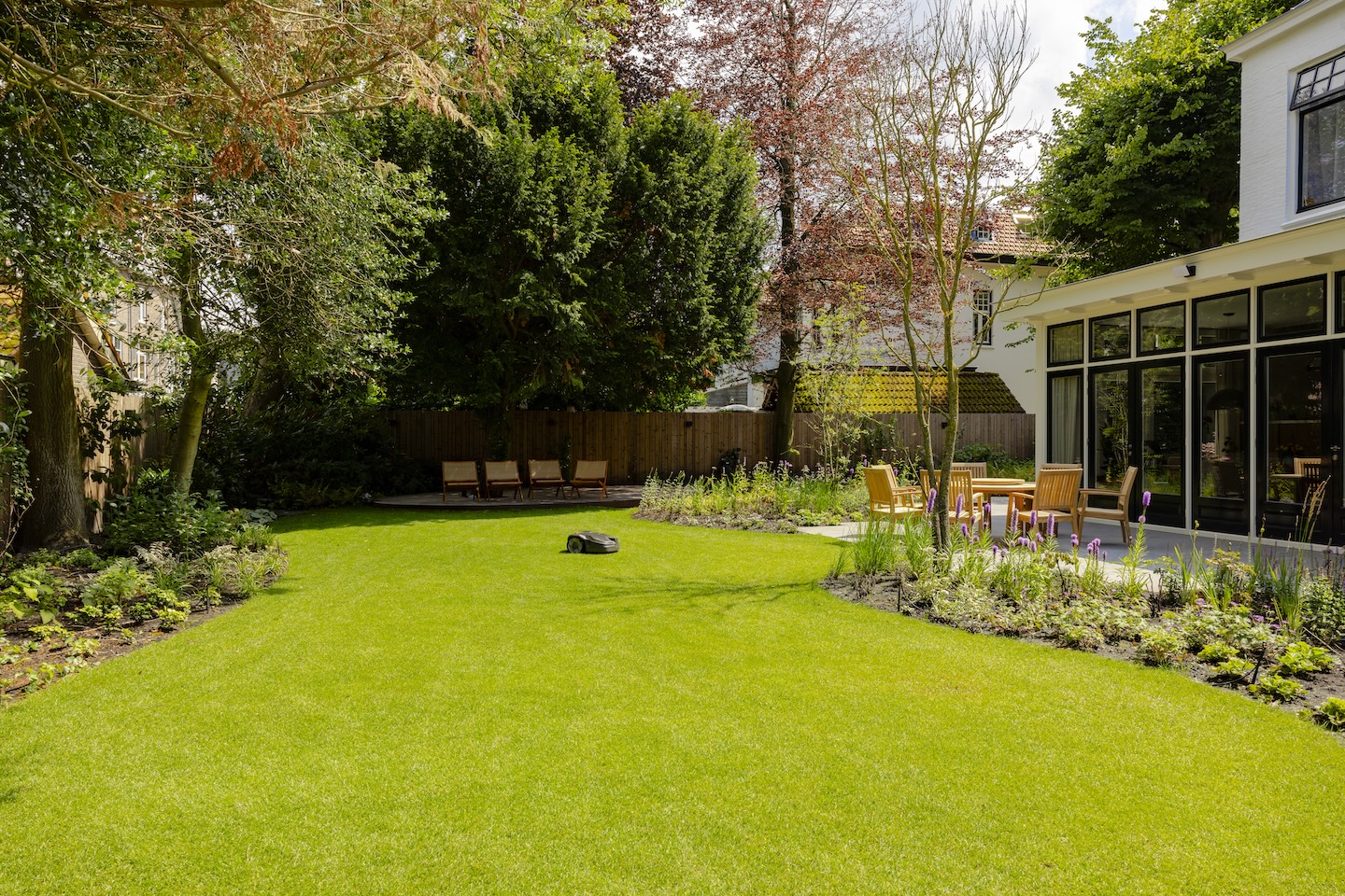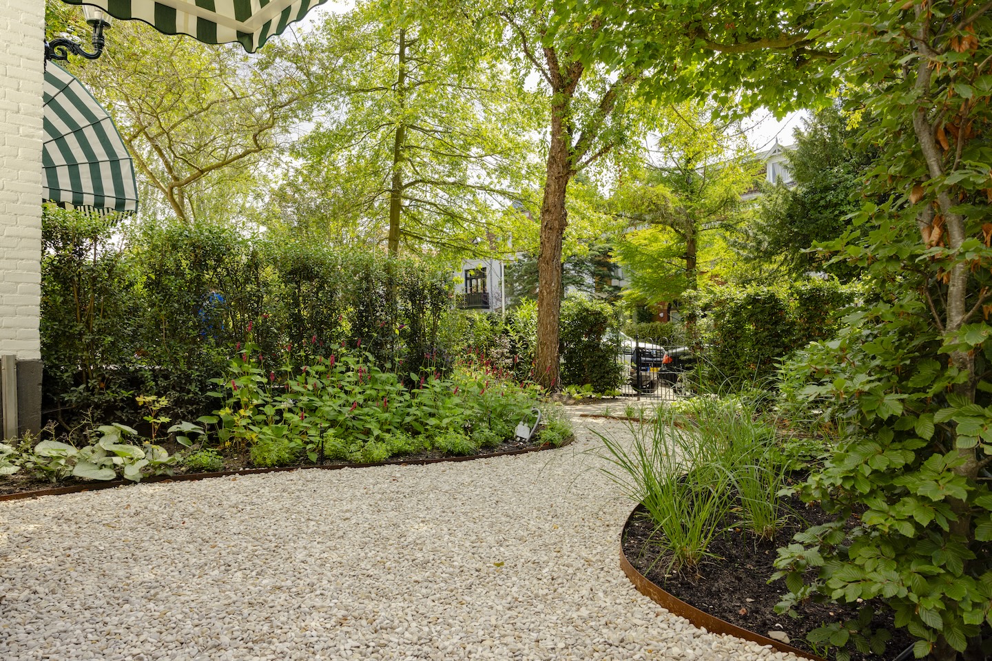 De voortuin is een parkachtige ruimte gebleven, waar bestaande bomen zijn behouden en omrand door weelderige borders. Hier zijn zorgvuldig geselecteerde planten en bloemen toegevoegd, waardoor kleurrijke accenten ontstaan die het hele jaar door een levendige uitstraling hebben. Een terras met keramische tegels in lichte grijstinten biedt een fijne plek om te ontspannen, en is afgesloten door organische borders die het zicht op het gazon verzachten.