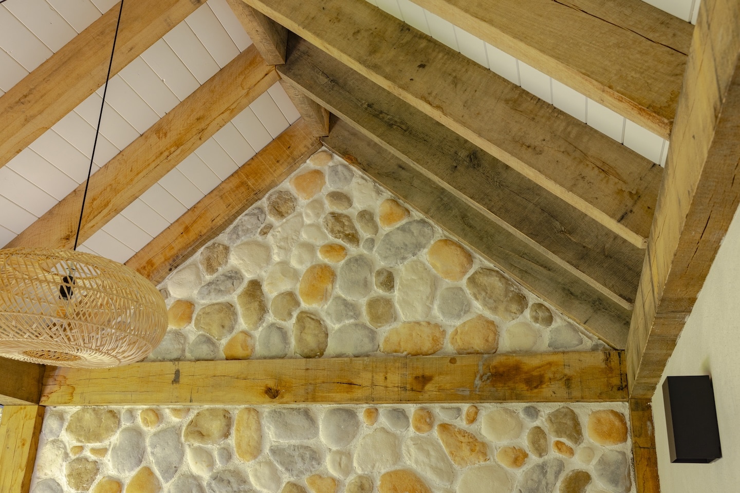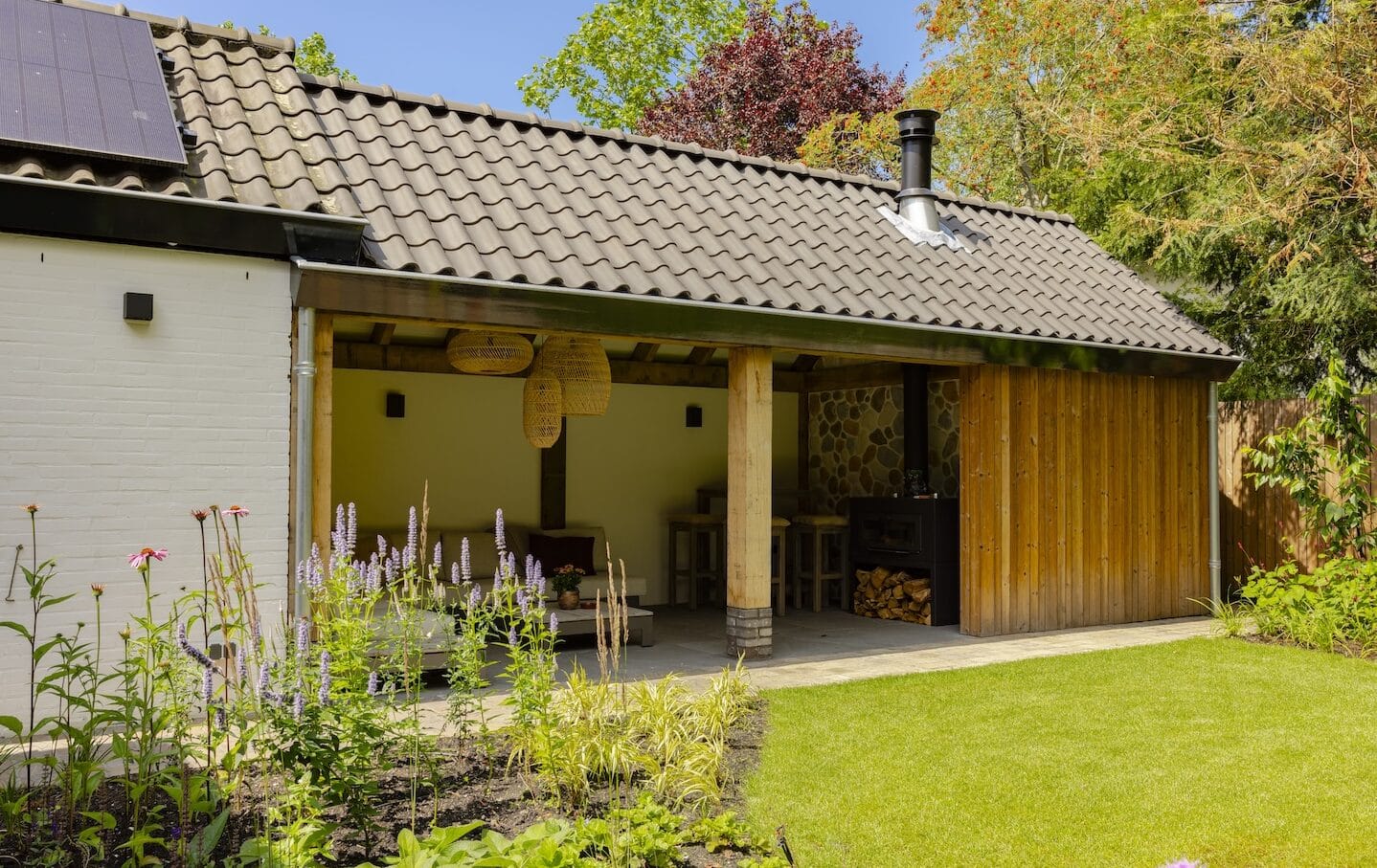 De bestaande oude bomen zijn zorgvuldig verwijderd, waardoor er ruimte is gecreëerd voor een nieuwe sfeer. In de achtertuin prijkt nu een elegant buitenverblijf, opgetrokken uit eikenbalken, met zowel een haard voor gezellige avonden als ruimte voor opslag. Dit ruime toevluchtsoord biedt niet alleen comfort voor het gezin, maar fungeert ook als een plek voor de kinderen en hun vrienden om samen te komen zonder in het zicht van binnen te zijn.