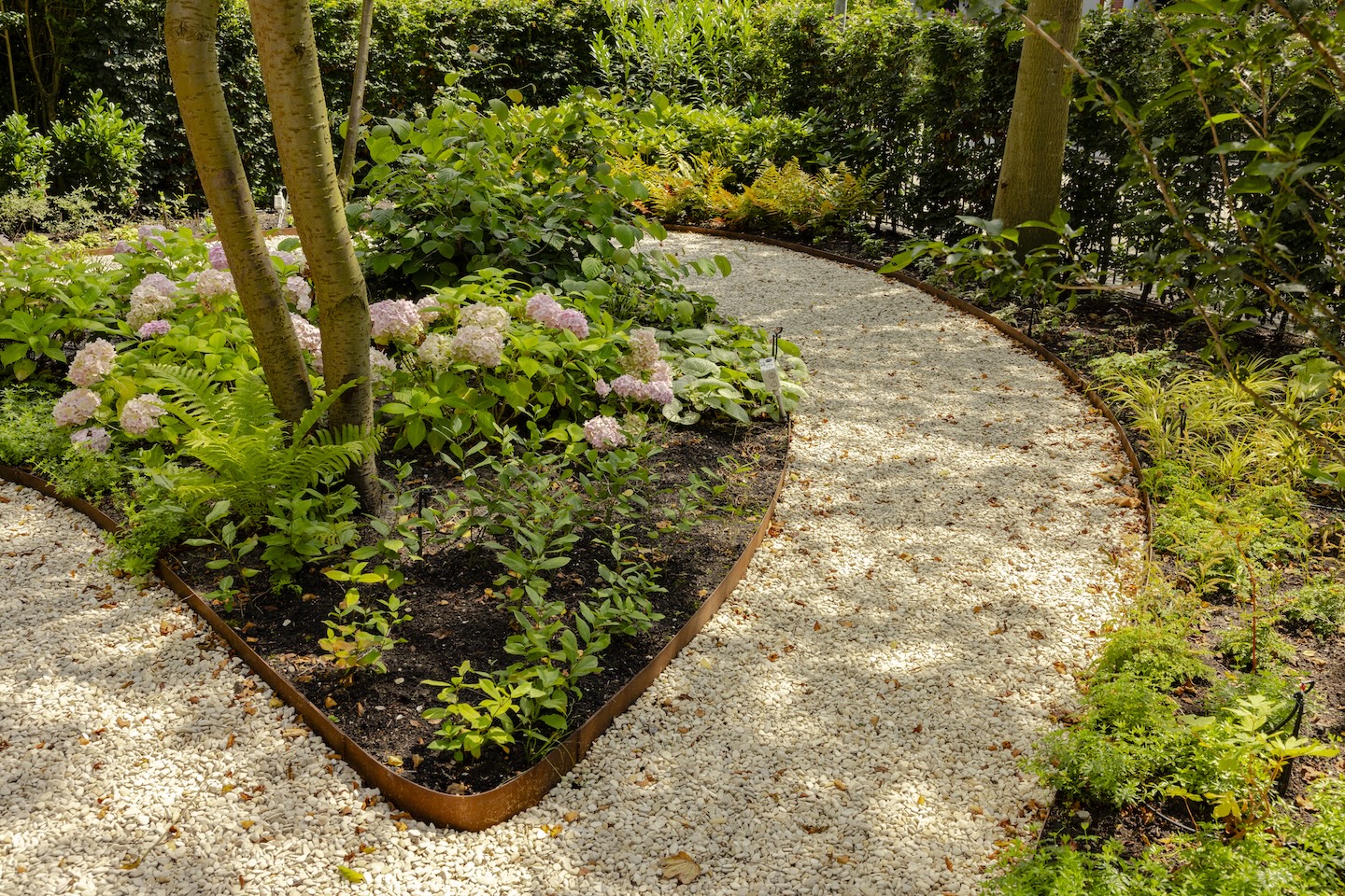 Om de privacy te waarborgen, zijn er strategisch hoge Carpinus-elementen geplant, die een natuurlijke afscheiding bieden zonder dat het de openheid van de tuin belemmert. Het ontwerp maakt gebruik van hoogteverschillen die door de tuin slingeren, wat een speelse en dynamische sfeer creëert. De vrij beweeglijke paden, aangelegd met castle grind, leiden je langs de verschillende zones en uitnodigende zitplekken, zodat elk plekje optimaal benut wordt.
