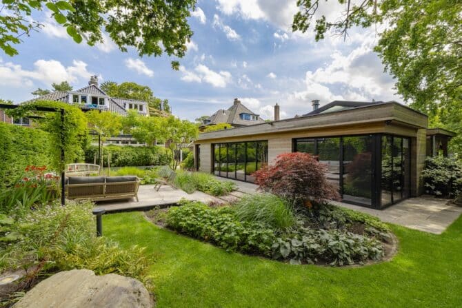 De tuin ligt op een veenlaag, waardoor er meer sprake is van verzakking. De voorbereidende grondwerkzaamheden bestonden onder andere uit het aanbrengen van een extra stevige fundering. Het buitenverblijf hebben we met schroefpalen onderheid.